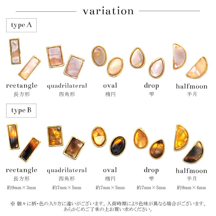 サイズ 長方形:約9mm×3mm 四角形:約7mm×5mm 楕円形:約7mm×5mm 雫形:約7mm×5mm 半月形:約9mm×4mm 各3個入り (厚さ約2mm) カラー タイプA/タイプB ネコポス 可 ネコポス送料無料 その他注意事項 ※お使いのブラウザや、画面設定により商品のカラーが異なって見える場合がございます。